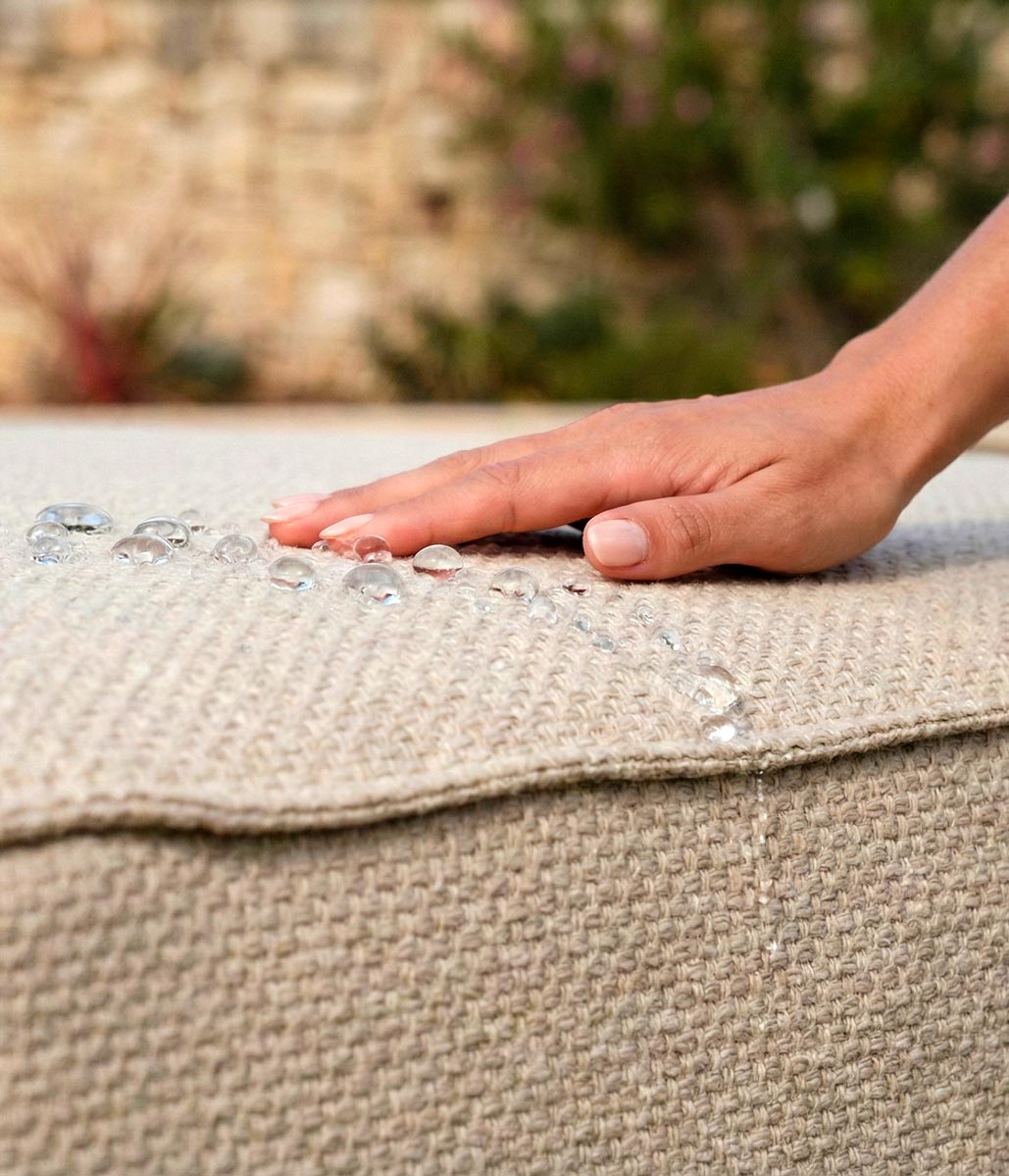 Oubliez la corvée de rentrer les coussins à la moindre averse. Nos tissus techniques déperlants laissent l'eau glisser à la surface sans jamais pénétrer. Le véritable luxe, c'est de profiter d'un confort exceptionnel qui reste dehors toute l'année, sans aucun entretien.