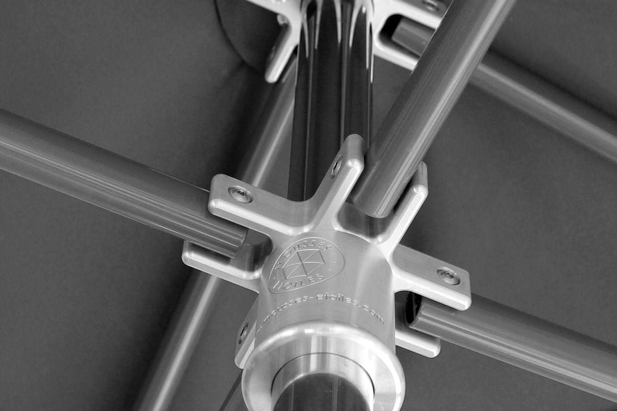 - Parasols Haute Résistance : Des modèles renforcés avec mâts en Inox et moyeux taillés dans la masse, capables d'encaisser les assauts du vent sans plier.